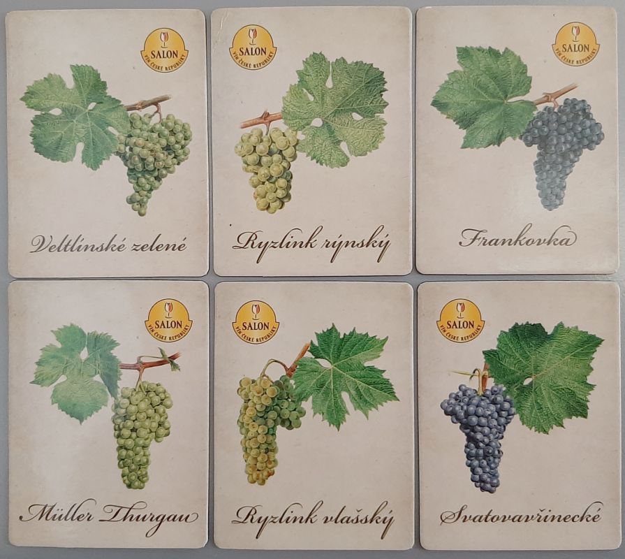Sada šesti magnetek s kresbami nejrozšířenějších odrůd révy vinné v ČR - Veltlínské zelené, Müller…