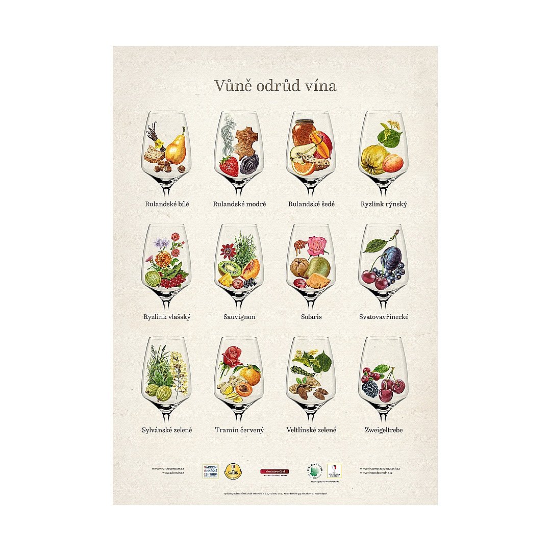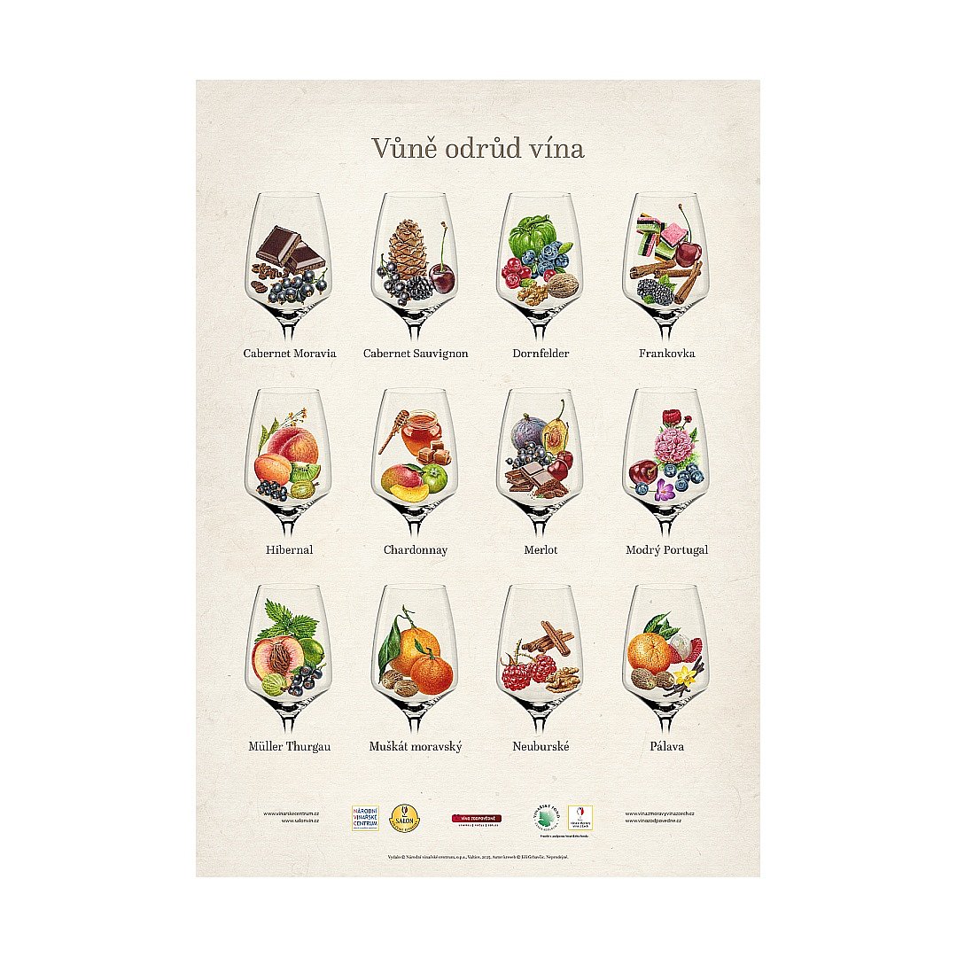 Unikátní kolekce dvou plakátů obsahuje 24 kreslených obrázků sklenic s vyobrazením hlavních charakteristik (ovoce, koření atd.) našich nejrozšířenějších odrůd. Formát A2. Po zarámování vhodné jako dekorace pro vinotéky, degustační místnosti atd. Neprodejný materiál (zdarma, zájemce platí pouze náklady na dopravu). V případě objednávky většího počtu ks si NVC vyhrazuje právo počet limitovat.