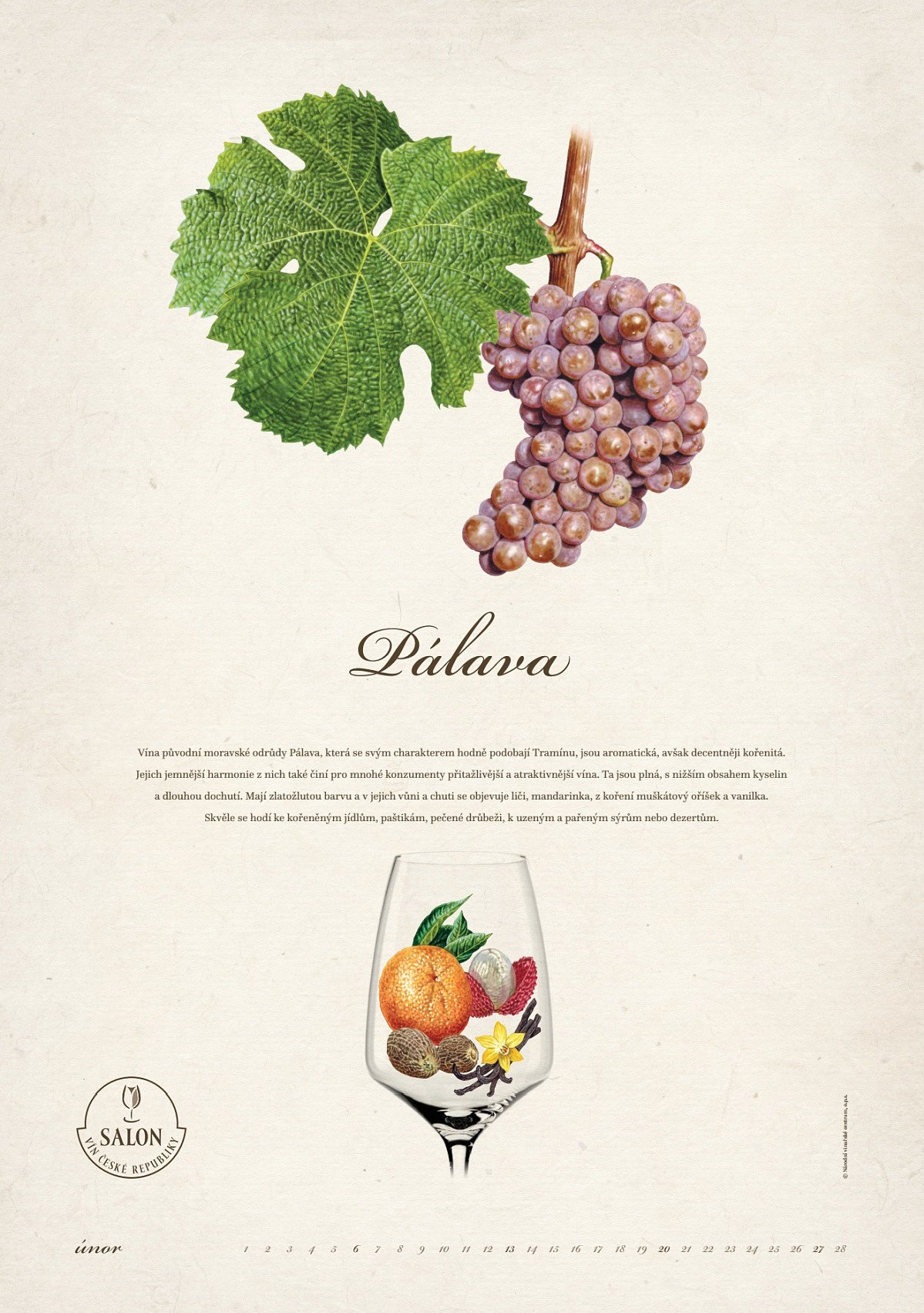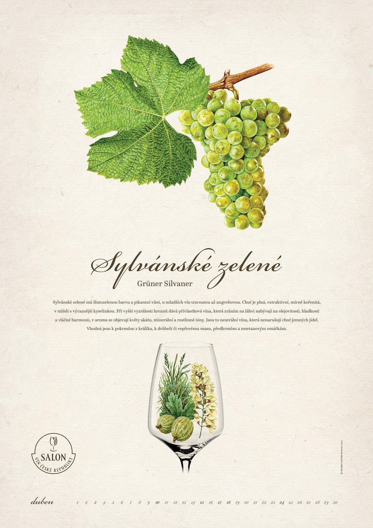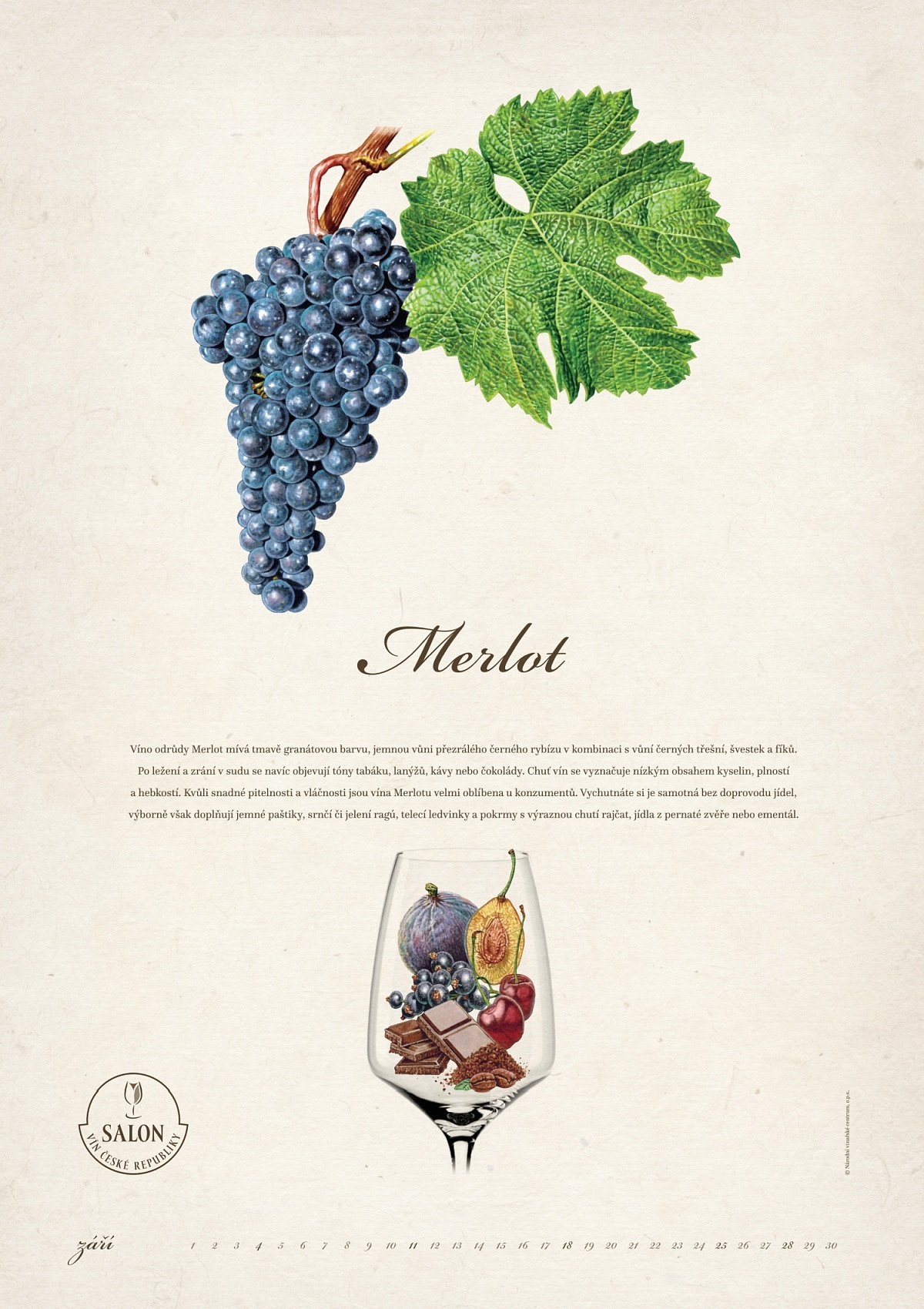 Pokračování loňského nástěnného kalendáře s krásnými malbami dalších nejrozšířenějších odrůd v ČR. Kromě věrného zobrazení moštových odrůd révy vinné, přehledu dnů v měsíci a textových charakteristik obsahuje i kresby nejtypičtějších vůní vín odrůd: Cabernet Moravia, Pálava, Hibernal, Sylvánské zelené, Muškát moravský, Neuburské, Cabernet Sauvignon, Dornfelder, Merlot, André, Modrý Portugal a Tramín červený.