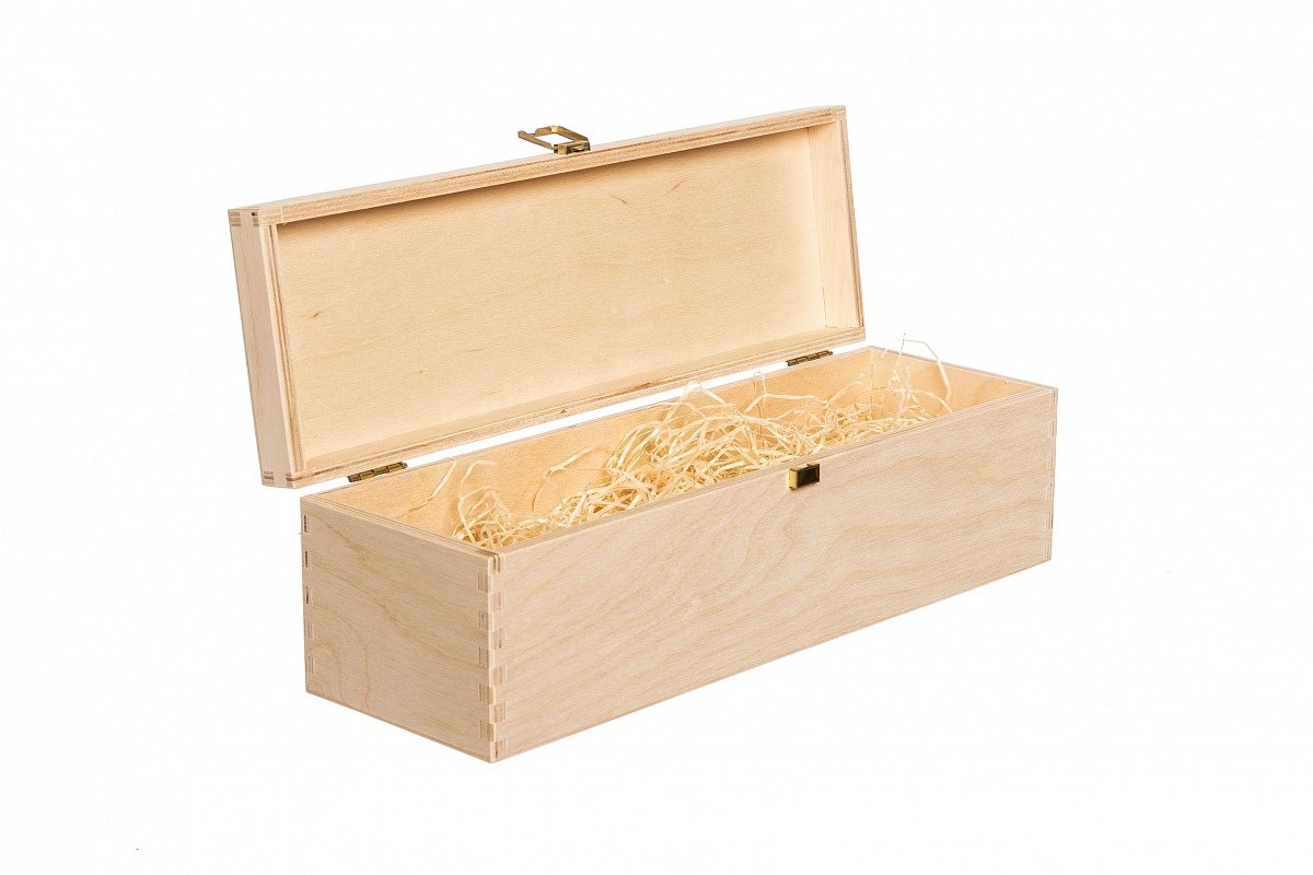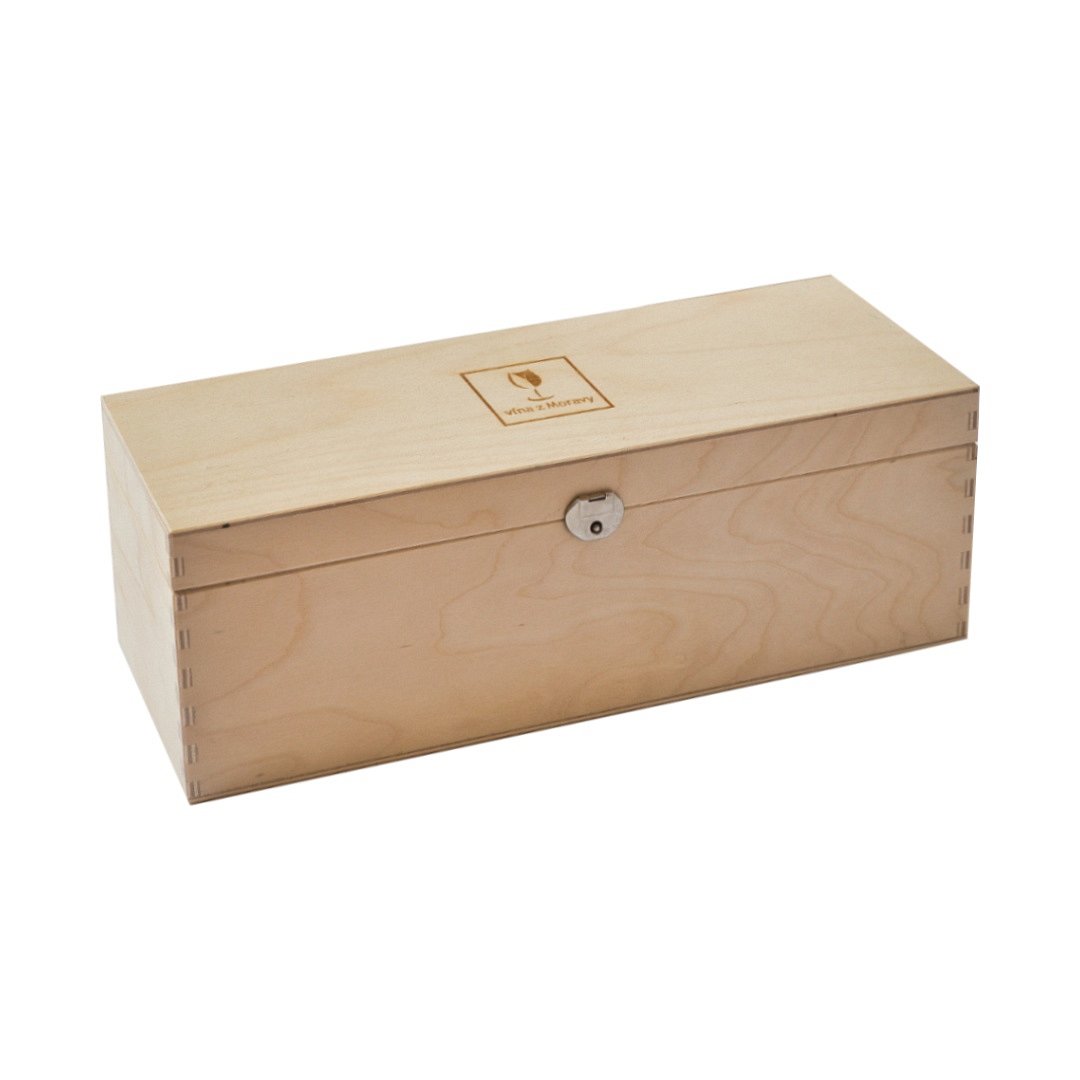 Dřevěná kazeta na 1 sektovou láhev, dvířka na otevírání s panty, logo Vína z Moravy. Vnitřní rozměry 33 x 10 x 10 cm. Materiál - světlé dřevo bez povrchové úpravy.