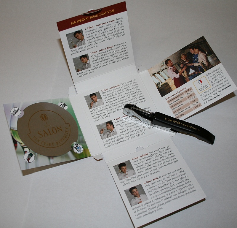 Dárkové balení vývrtky a dvou nálevek s potiskem loga Salonu vín. Krabička obsahuje i základní informace a ukázky sommelierských dovedností.
