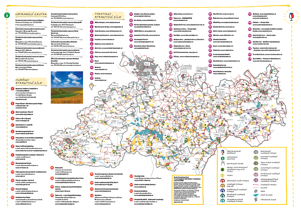Turisticko-vinařská mapa Moravy vydaná v roce 2025. Vyznačeny jsou zde vinařsky atraktivní a turistické cíle.
