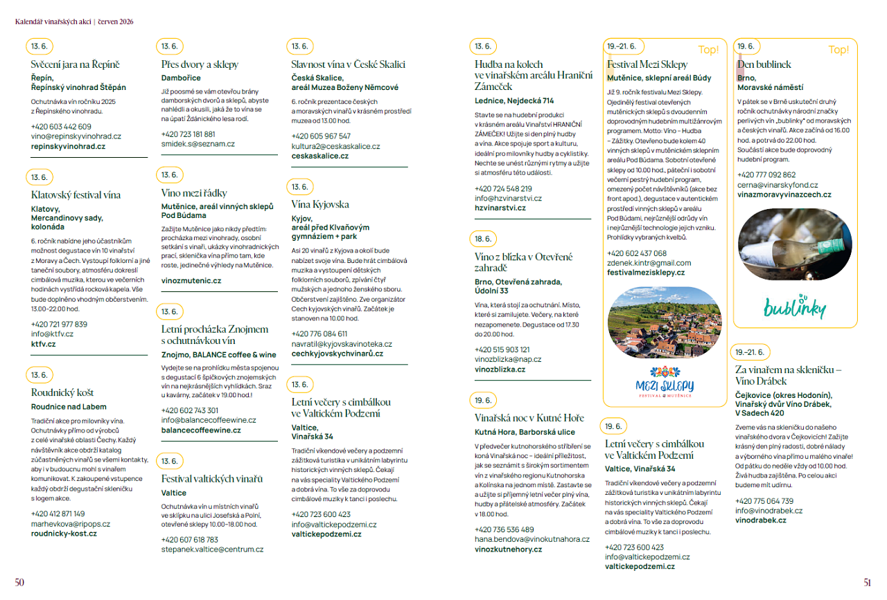 Kalendář vám usnadní orientaci v pestré nabídce vinařských akcí, které byly naplánovány po celé České republice, ale převážně ve vinařských oblastech, na rok 2026. Najdete v něm téměř 800 akcí, které jsou řazeny podle data konání.