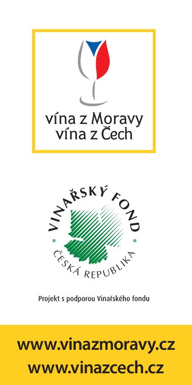 Vinylový banner s logy Vína z Moravy, Vína z Čech a Vinařského fondu a textem "Projekt s podporou Vinařského fondu". Uvedeny taktéž webové stránky www.vinazmoravy.cz a www.vinazcech.cz.