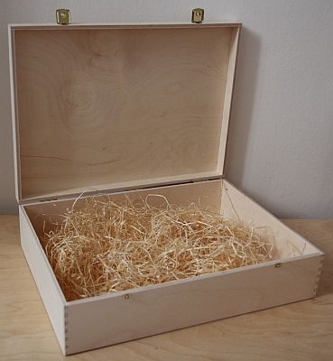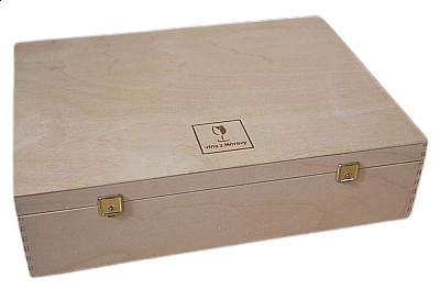 Dřevěná kazeta na 3 láhve typ futura (vyšší), dvířka na otevírání s pantíky, logo Vína z Moravy. Vnitřní rozměry 36,2 x 26,4 x 9,8 cm.