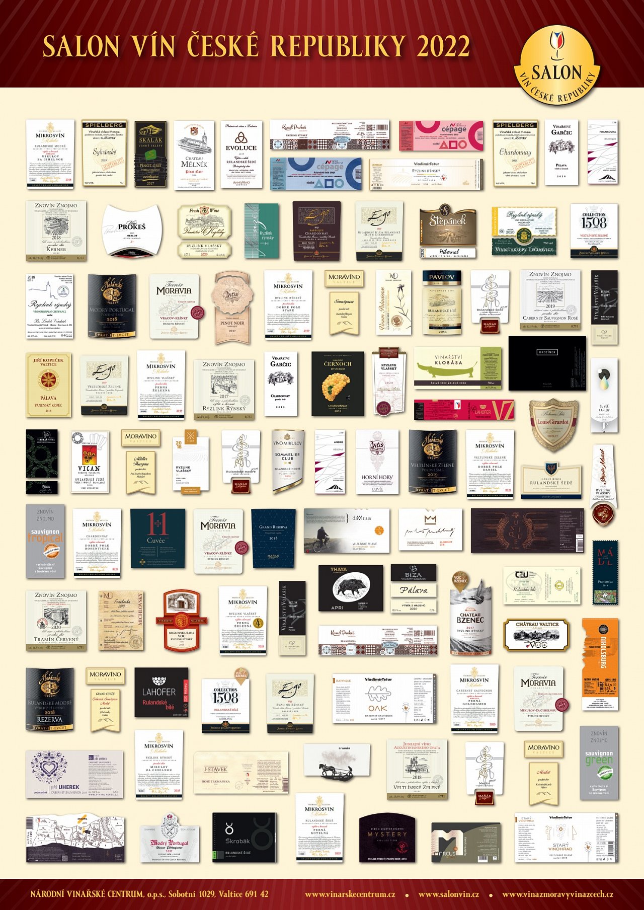 Plakát s vyobrazením etiket TOP 100 vín zařazených do kolekce Salon vín ČR 2022. Formát A2 (420 …