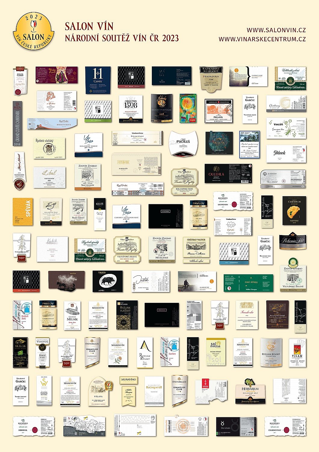 Plakát s vyobrazením etiket TOP 100 vín zařazených do kolekce Salon vín ČR 2023. Formát A2 (420 …