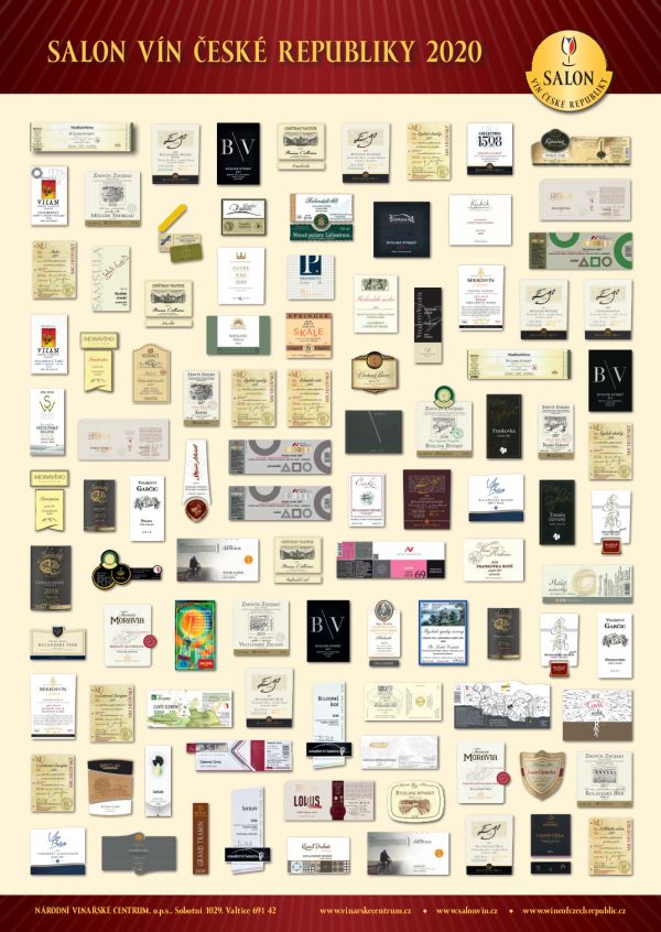 Plakát s vyobrazením etiket TOP 100 vín zařazených do kolekce Salon vín ČR 2020. Formát A2 (420 …