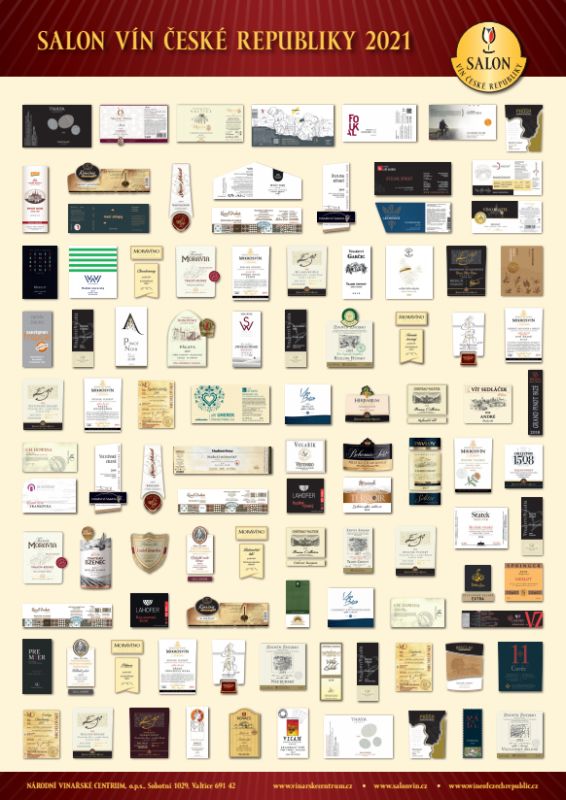 Plakát s vyobrazením etiket TOP 100 vín zařazených do kolekce Salon vín ČR 2021. Formát A2 (420 …