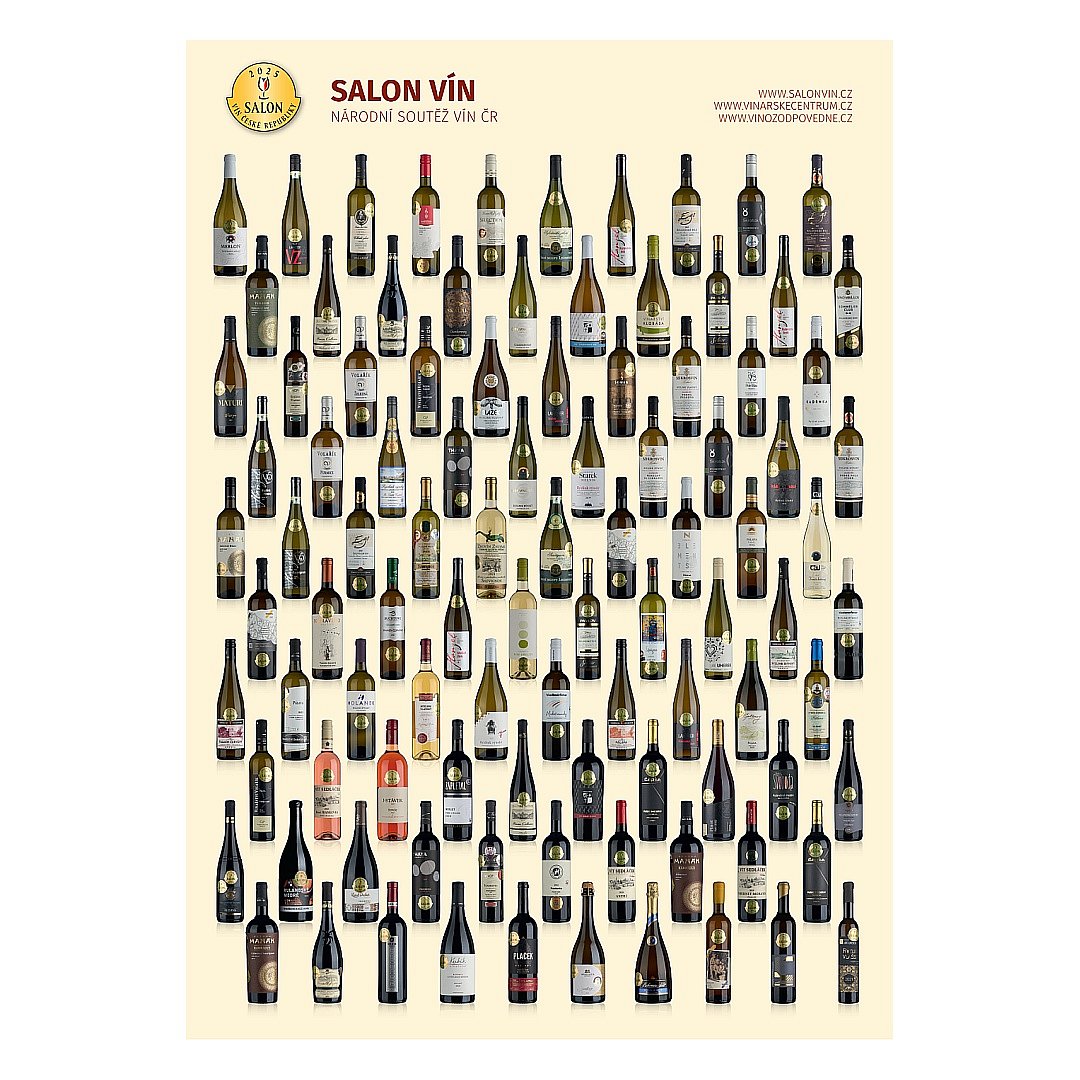 Plakát s vyobrazením lahví TOP 100 vín zařazených do kolekce Salon vín ČR 2023. Formát A2 (420 …
