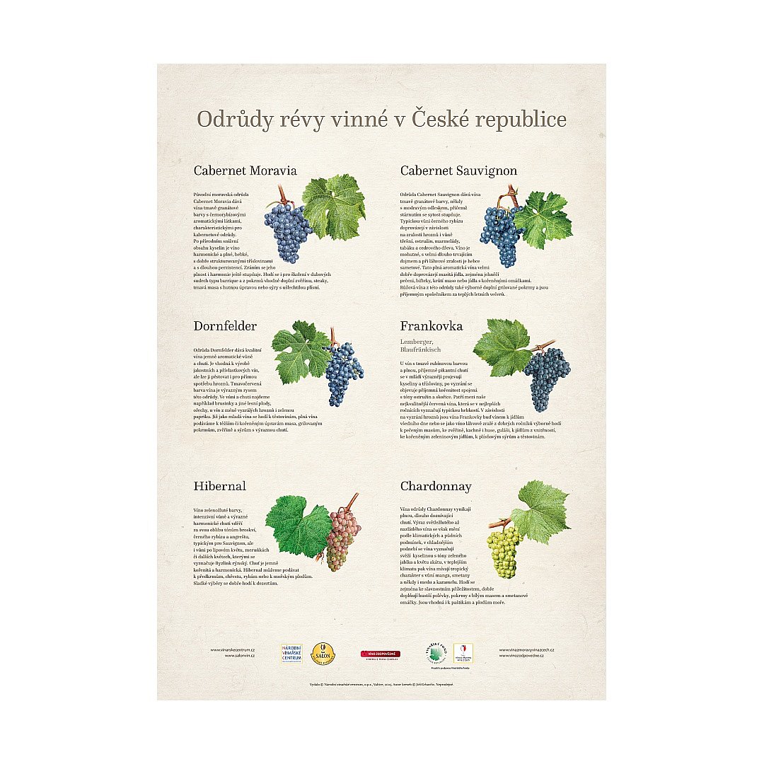 Unikátní kolekce čtyř plakátů obsahuje 24 kreslených obrázků hroznů a listů našich…