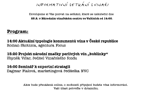 Nejprve vám ředitel výzkumné agentury Focus Roman Skotnica představí závěry tzv. segmentační analýzy, kterou si Vinařský fond nechává zpracovat jednou za čtyři roky. Definuje klíčové skupiny zákazníků podle jejich socio-ekonomických charakteristik a chování. Poté ředitel Vinařského fondu Zbyněk Vičar popíše aktuální stav projektu národní značky perlivých vín „bublinky“. Velice důležitá přitom bude vaše zpětná vazba ohledně zájmu o výrobu těchto produktů, která bude důležitá pro načasování a velikost kampaně. Nakonec marketingová ředitelka NVC Dagmar Fialová představí exportní manuál, který shrnuje podstatné informace pro jednotlivé země.