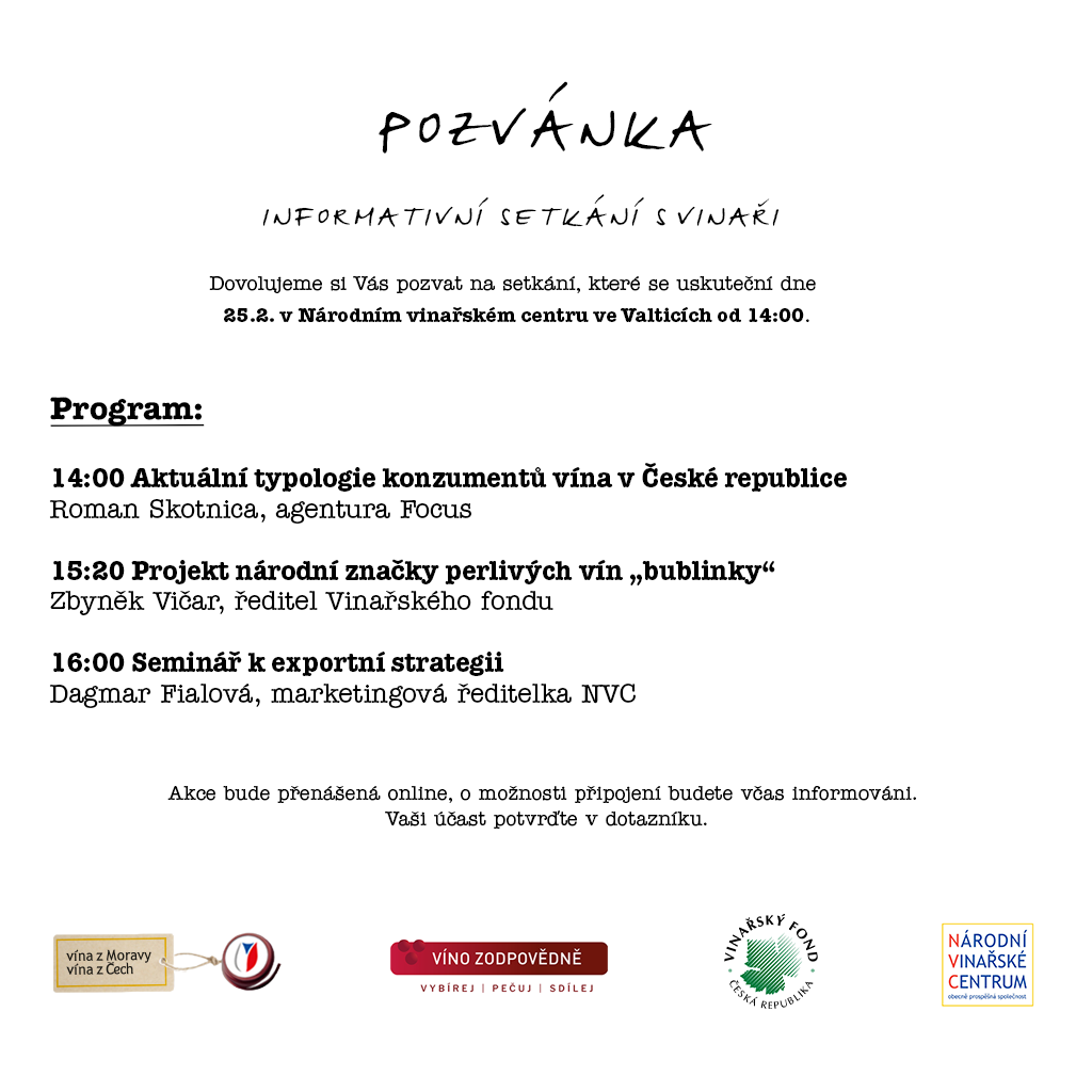 Vážené vinařky, vážení vinaři, dovolujeme si vás pozvat na sérii prezentací, která se uskuteční 25. 2. od 14.00 hod. v Národním vinařském centru ve Valticích.