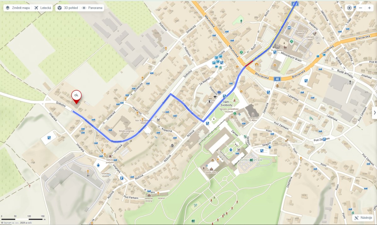 Při příjezdu od Mikulova můžete odbočit do první ulice vpravo (Střelecká) a následně do první vlevo (Poštovní) a projet jimi k ulici Sobotní.