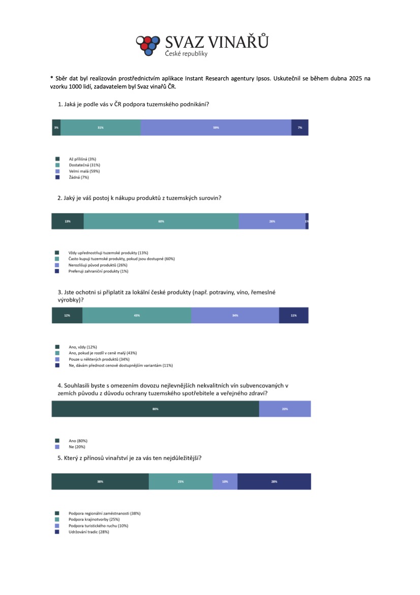 Podle aktuálního průzkumu provedeného prostřednictvím aplikace Instant Research společnosti Ipsos* tři čtvrtiny lidí (73 %) upřednostňují domácí produkci, 80 % z nich by navíc souhlasilo s omezením dovozu nejlevnějších nekvalitních vín subvencovaných v zemích původu z důvodu ochrany tuzemského spotřebitele a veřejného zdraví. Tato vína se těší největší spotřebě, zároveň se však mezi víny největší měrou podílí na škodlivé a závislostní konzumaci a jejich dovoz je spojen s nejvýraznějším zatížením uhlíkovou stopou.
