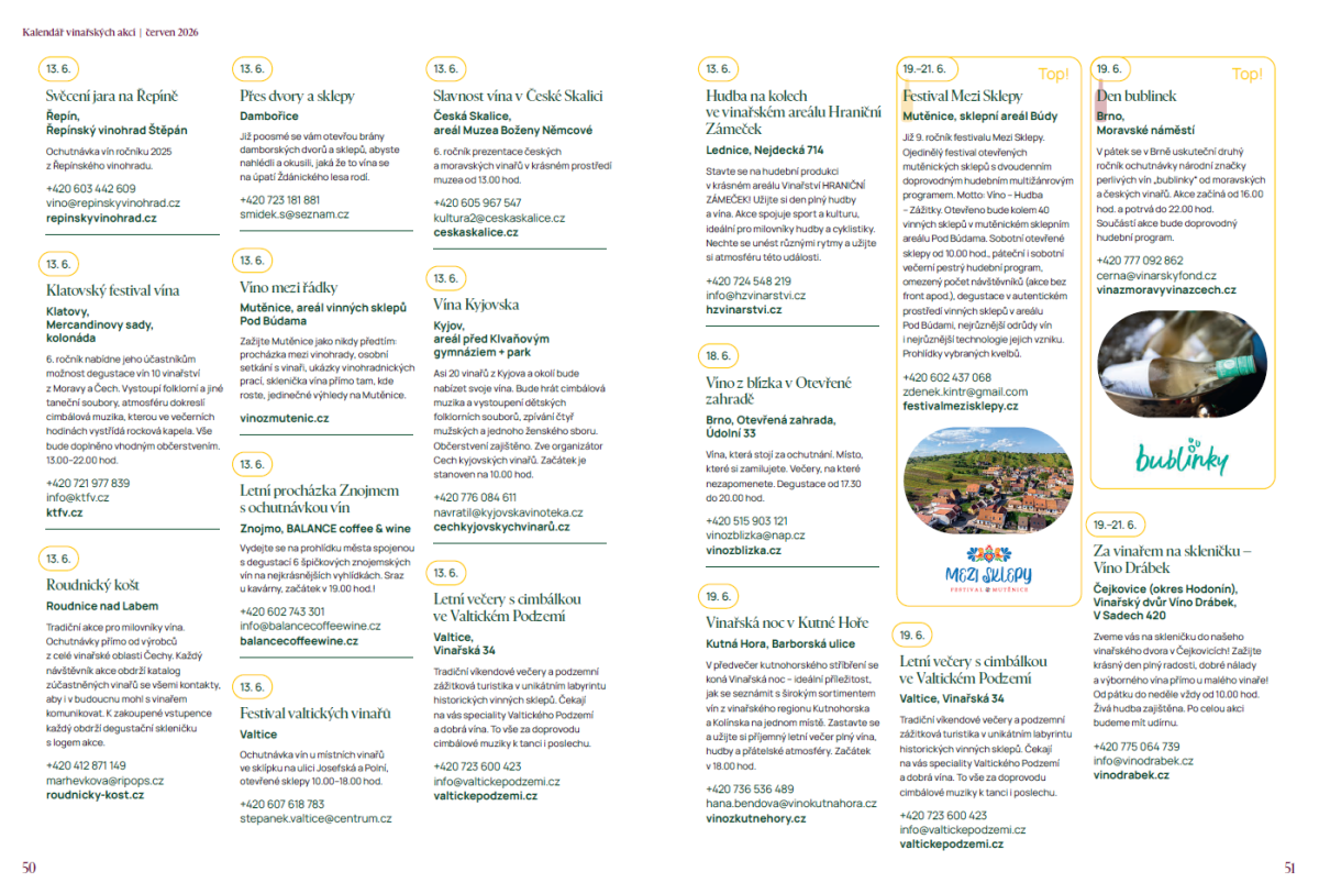 Díky tomu se informace o vinařských akcích dostávají k široké veřejnosti, turistům i odborné veřejnosti prostřednictvím různých komunikačních kanálů a regionálních i celostátních platforem – aktuálně, přehledně a z jednoho zdroje.