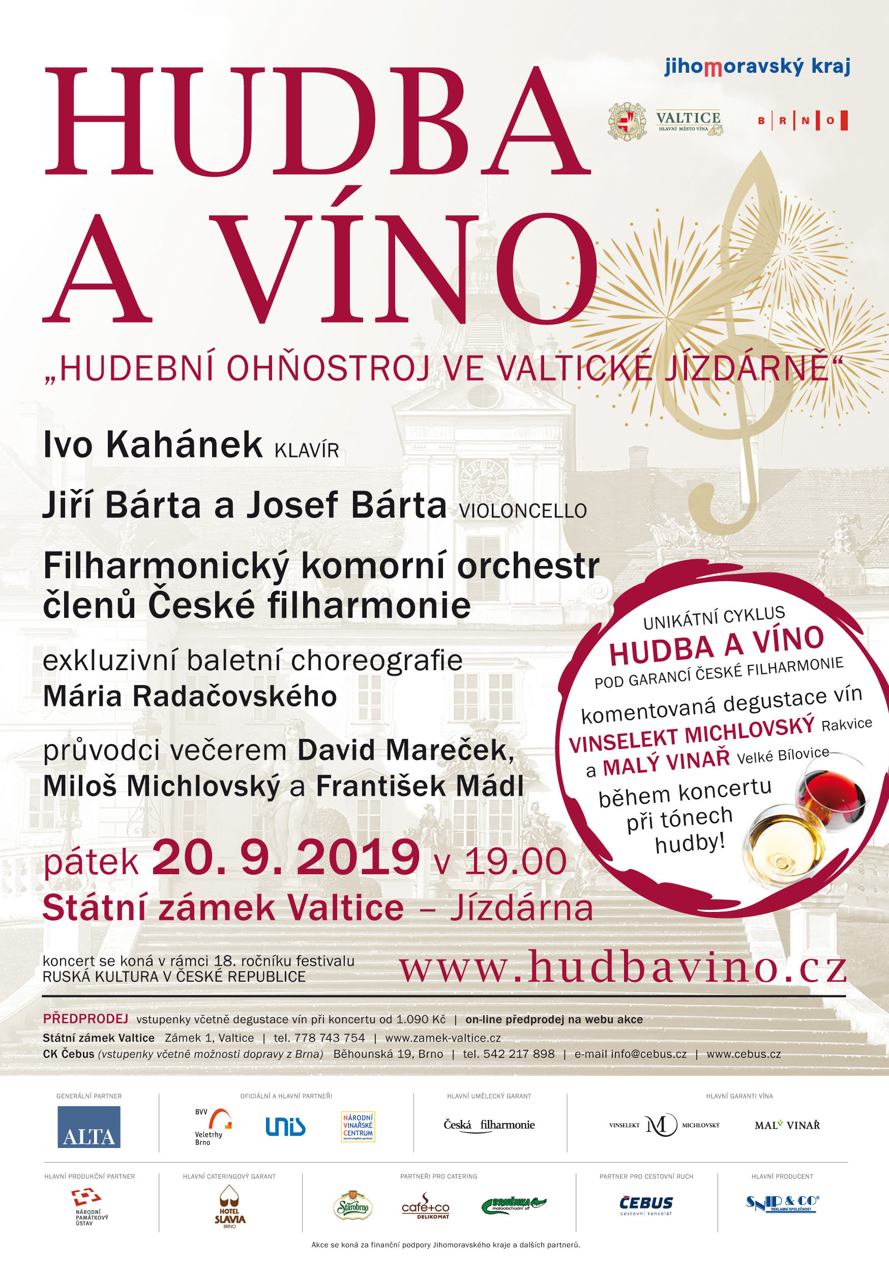 5. ročník unikátního cyklu HUDBA A VÍNO HUDEBNÍ OHŇOSTROJ VE VALTICKÉ JÍZDÁRNĚ pod garancí České filharmonie. Pátek 20. září 2019 v 19:00 • Státní zámek Valtice – Jízdárna.