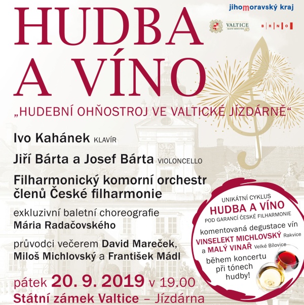Ivo Kahánek – klavír Jiří Bárta a Josef Bárta – violoncello Filharmonický komorní orchestr Hudba a víno vstupují do pátého ročníku, který ozdobí hned dva hvězdní sólisté. Klavírista Ivo Kahánek a violoncellista Jiří Bárta přednesou virtuózní koncerty Wolfganga Amadea Mozarta a Josepha Haydna. Členové České filharmonie a jejich hudební přátelé představí tři nejslavnější skladby pro smyčcový orchestr – Mozartovu Malou noční hudbu, Dvořákovu a Čajkovského Serenádu. Překvapením večera bude vystoupení mladého talentovaného violoncellisty Josefa Bárty, který, jak jméno napovídá, jde ve stopách svého slavného tatínka. Hudební ohňostroj doplní dvě světově proslulé skladby Rachmaninova a Korsakova ve strhujícím společném podání obou sólistů, Jiřího Bárty a Ivo Kahánka. Valtický hudební ohňostroj vám nedá vydechnout a jeho účinek posílí tradiční vinná degustace se zaníceným komentářem vinařů Miloše Michlovského a Františka Mádla a také ředitele České filharmonie Davida Marečka. VÍCE INFORMACÍ A ON-LINE VSTUPENKYNovinky e-mailem