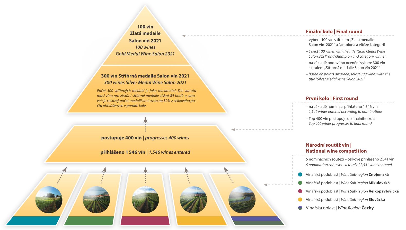 „Za 20 let své existence se stal Salon vín etalonem kvality jak prezentovaných vín, tak unikátního systému jejich hodnocení. Zatímco v prvních ročnících soutěže se počet návštěvníků Salonu vín, tedy absolventů některého z degustačních programů, pohyboval do 5 tisíc, aktuálně se celoroční návštěvnost blíží 23 tisícům. Podobné je to i u zájmu vinařů o soutěž. V prvních letech komise vybíraly z 300 až 400 nominovaných vín, letos se jejich počet bude pohybovat kolem 1300“, sdělil Ing. Pavel Krška, ředitel Národního vinařského centra a pořadatel soutěže. Soutěž se v průběhu let vyvíjela, až se ustálila na trojkolovém systému hodnocení. První fáze hodnocení probíhá obvykle od června do září v jednotlivých moravských vinařských podoblastech (Znojemská, Mikulovská, Velkopavlovická, Slovácká) a ve vinařské oblasti Čechy. Jde o nominační kola Národní soutěže vín, tedy prvního stupně naší největší a nejvyšší soutěže vín. Následuje, právě připravované, 1. už celostátní kolo Salonu vín – národní soutěže a celá soutěž vyvrcholí 2. finálovým kolem a výběrem absolutních vítězů. Budoucí Šampion a každý držitel titulu Zlatá medaile Salon vín 2020 tak musí postupně projít třemi koly profesionálního hodnocení držiteli mezinárodních degustačních zkoušek dle evropských ISO norem, což zaručuje objektivitu a vysokou úroveň celé soutěže. I díky tomu je Salon vín – národní soutěž vín výkladní skříní českého a moravského vinařství a titul Šampiona je nejvyšší dosažitelnou metou pro víno v České republice. Prestižní ocenění zlatými a stříbrnými medailemi Salonu vín – národní soutěže vín jsou pak nezpochybnitelnou garancí nejvyšší možné kvality vín. Na vlastní soutěž navazuje od února následujícího roku Salon vín coby celoroční degustační expozice nejlepších sta vín. Zde je možné prostřednictvím několika typů degustačních programů, včetně tzv. „volné degustace“, programů řízených sommelierem a individuální degustace z prezentačního automatu, ochutnat nejlepší vína pro daný rok.Nominace do 1. kola