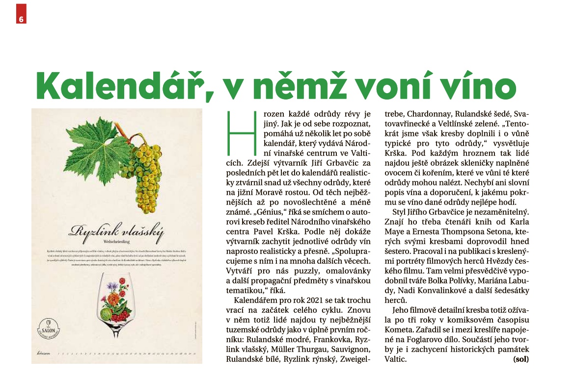 Zdejší výtvarník Jiří Grbavčic za posledních pět let do kalendářů realisticky ztvárnil snad už všechny odrůdy, které na jižní Moravě rostou. Od těch nejběžnějších až po novošlechtěné a méně známé. "Génius," říká se smíchem o autorovi kreseb ředitel Národního vinařského centra Pavel Krška. Podle něj dokáže výtvarník zachytit jednotlivé odrůdy vín naprosto realisticky a přesně. "Spolupracujeme s ním i na mnoha dalších věcech. Vytváří pro nás puzzly, omalovánky a další propagační předměty s vinařskou tematikou," říká. Kalendářem pro rok 2021 se tak trochu vrací na začátek celého cyklu. Znovu v něm totiž lidé najdou ty nejběžnější tuzemské odrůdy jako v úplně prvním ročníku: Rulandské modré, Frankovka, Ryzlink vlašský, Müller Thurgau, Sauvignon, Rulandské bílé, Ryzlink rýnský, Zweigeltrebe, Chardonnay, Rulandské šedé, Svatovavřinecké a Veltlínské zelené. "Tentokrát jsme však kresby doplnili i o vůně typické pro tyto odrůdy," vysvětluje Krška. Pod každým hroznem tak lidé najdou ještě obrázek skleničky naplněné ovocem či kořením, které ve vůni té které odrůdy mohou nalézt. Nechybí ani slovní popis vína a doporučení, k jakému pokrmu se víno dané odrůdy nejlépe hodí. Styl Jiřího Grbavčice je nezaměnitelný. Znají ho třeba čtenáři knih od Karla Maye a Ernesta Thompsona Setona, kterých svými kresbami doprovodil hned šestero. Pracoval i na publikaci s kreslenými portréty filmových herců Hvězdy českého filmu. Tam velmi přesvědčivě vypodobnil tváře Bolka Polívky, Mariána Labudy, Nadi Konvalinkové a další šedesátky herců. Jeho filmově detailní kresba totiž ožívala po tři roky v komiksovém časopisu Kometa. Zařadil se i mezi kreslíře napojené na Foglarovo dílo. Součástí jeho tvorby je i zachycení historických památek Valtic. Zdroj: Speciál DNES Datum vydání: 18.12.2020Novinky e-mailem