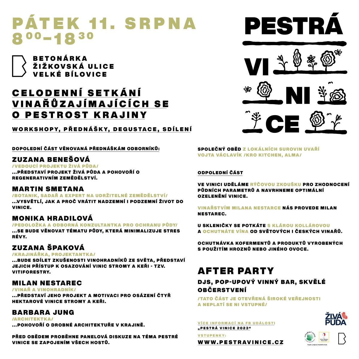 Více než padesát vinařů z Moravy a Čech se setká nad tématem Pestré vinice. Cílem je osvěta ve zvyšování diverzity krajiny ve vinohradu a kolem něj. Akce se uskuteční v pátek 11. srpna 2023 v areálu vinařství Milana Nestarce (v Betonárce) ve Velkých Bílovicích. Během celého dne se budou vinaři věnovat vzdělávání v oblasti výsadby stromů a jiných dřevin ve vinohradu, dále prohlubování vzájemné pospolitosti, sdílení znalostí a zkušeností a v neposlední řadě i myšlence zapojení umění do vinařství.
