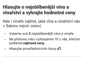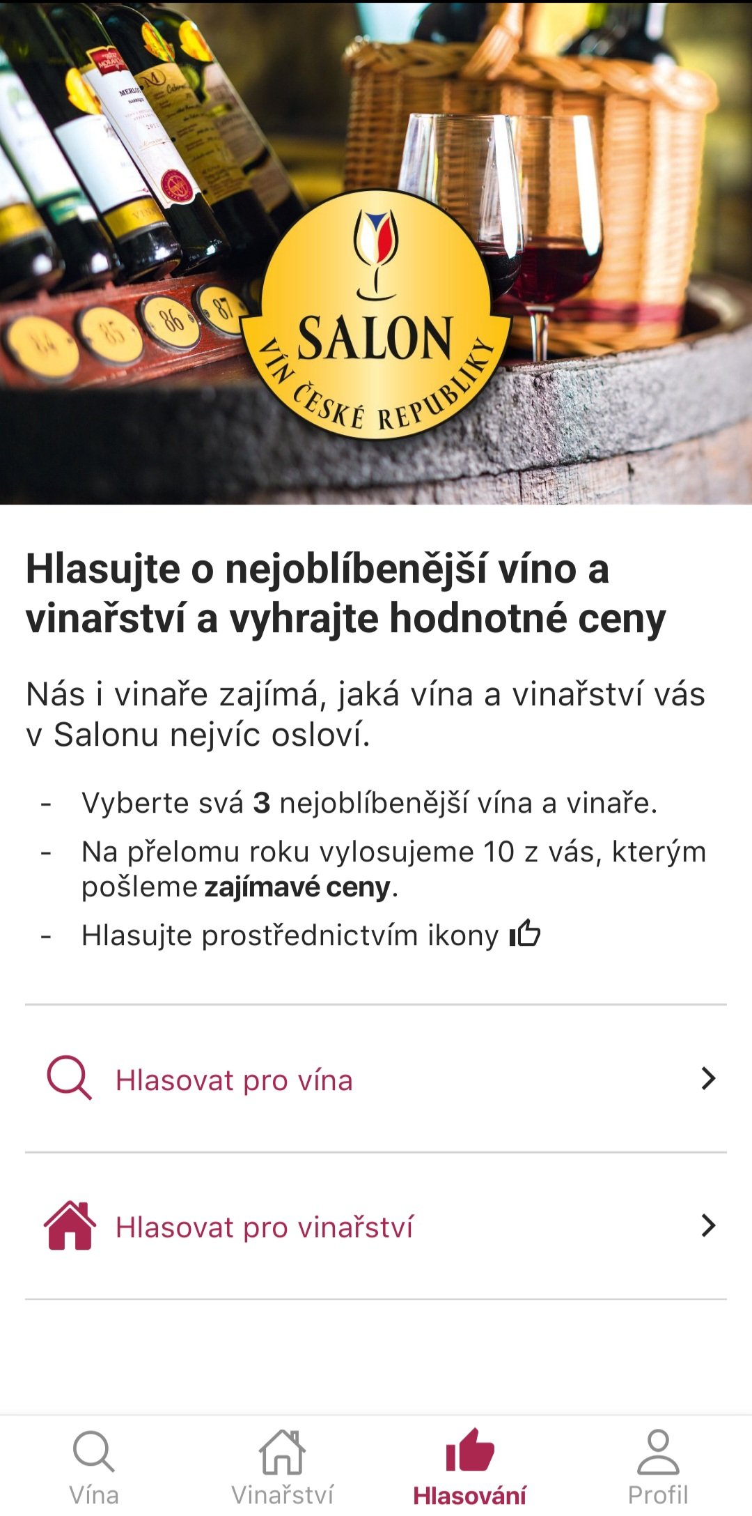 Nově mají návštěvníci možnost prostřednictvím hlasování v aplikaci vybrat svá nejoblíbenější vína a vinaře a zapojit se tak do soutěže. Na konci každé sezóny tým Salonu vín vylosuje celkem deset uživatelů, kterým pošlou opravdu zajímavé ceny, které každý milovník vína jistě ocení.