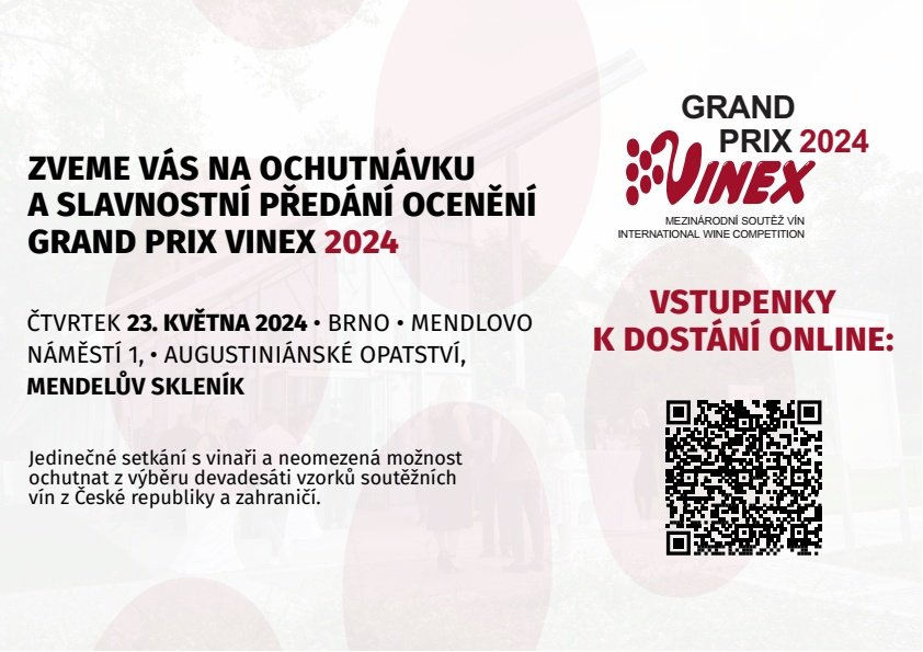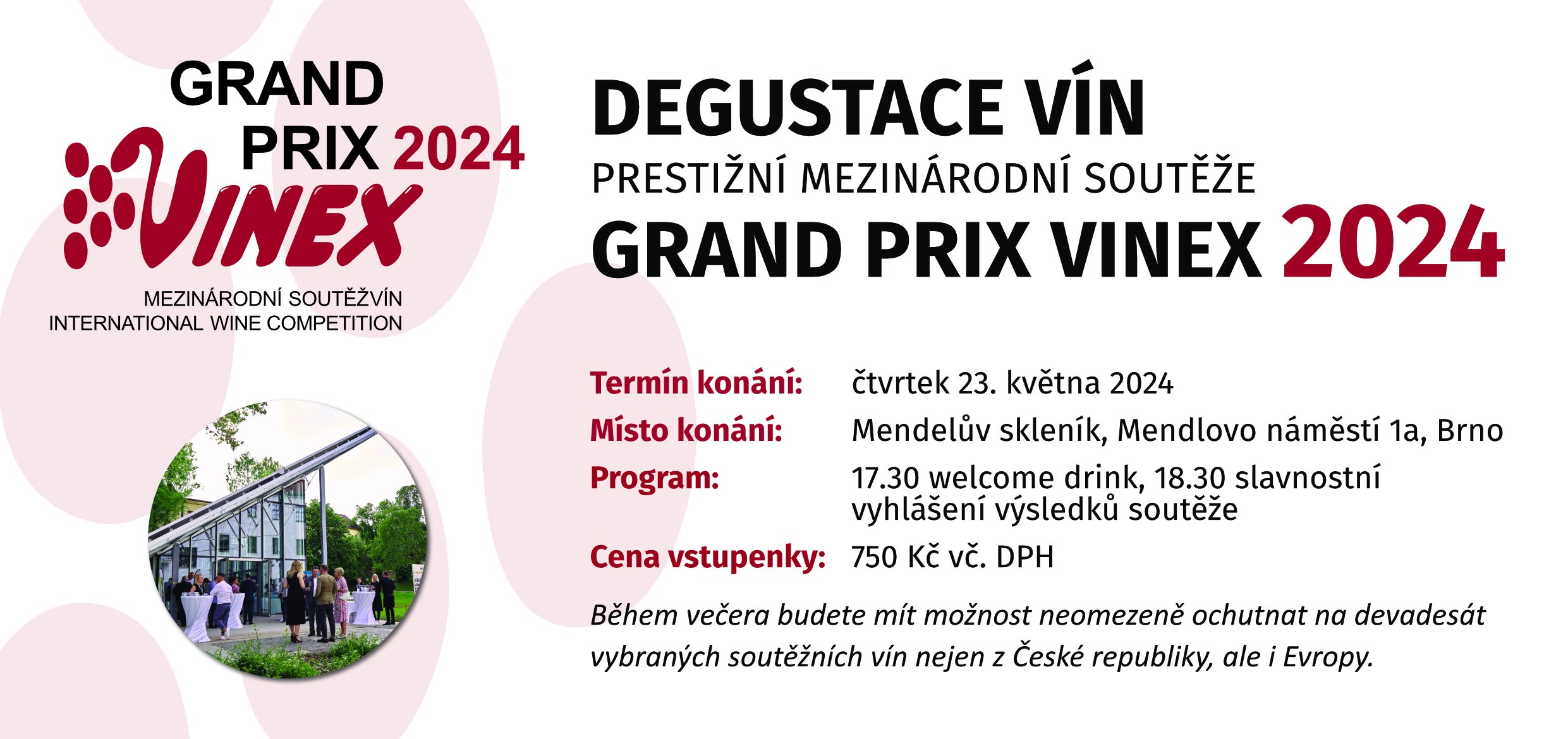 Jedinečné setkání milovníků vína a možnost ochutnat z výběru devadesáti vzorků nejen z České republiky, ale i Evropy. Přímo v Brně a v unikátním prostoru, který propojuje historii, současnost i budoucnost – v obnoveném Mendelově skleníku. Na této prestižní události a ve výjimečném prostředí bude předáno 14 hlavních ocenění letošního ročníku GRAND PRIX VINEX 2024. Soutěž organizuje Národní vinařské centrum se sídlem ve Valticích, ve spolupráci s akciovou společností Veletrhy Brno a Svazem vinařů České republiky.