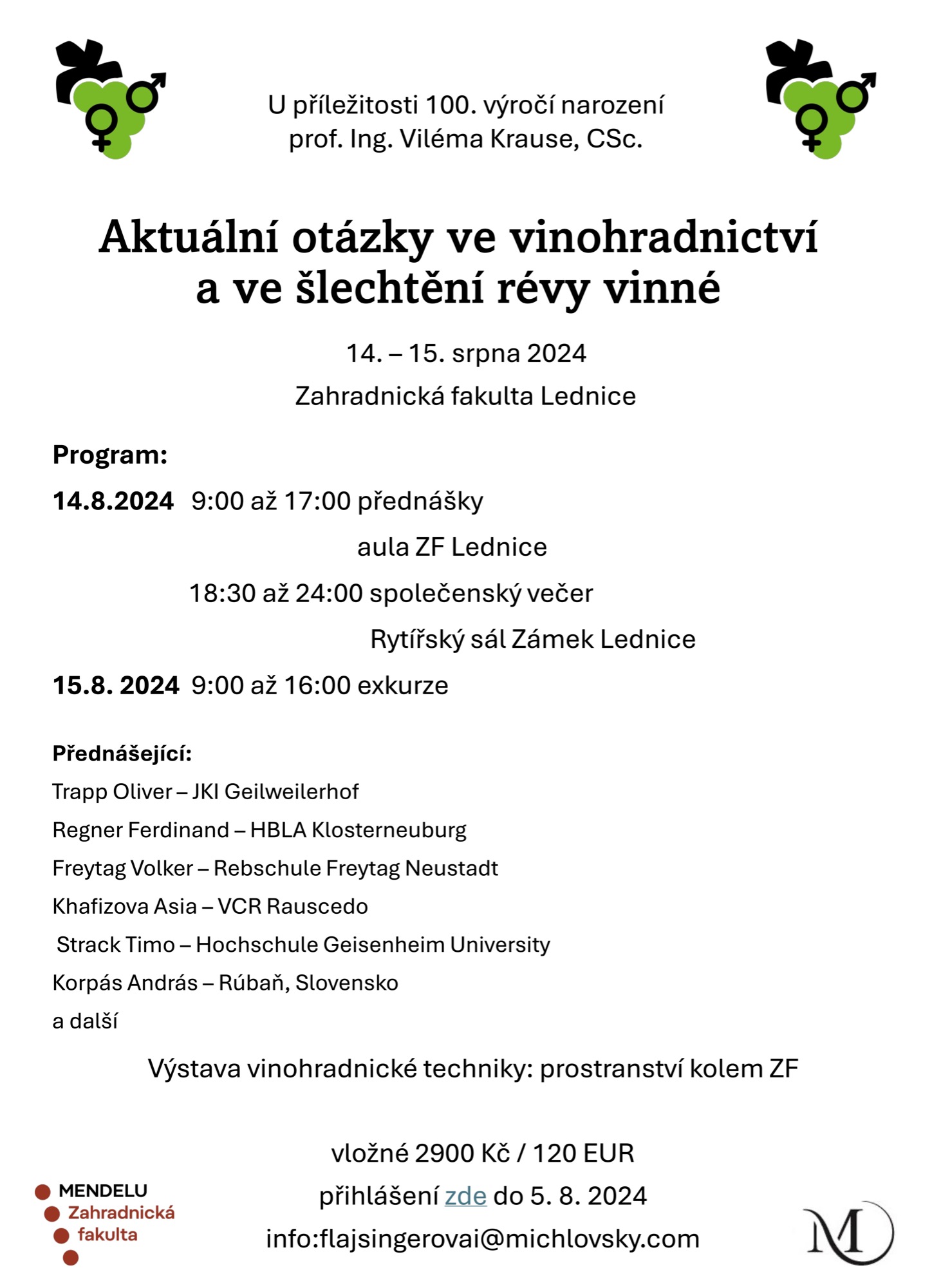 U příležitosti 100. výročí narození prof. Ing. Viléma Krause, CSc. vás Zahradnická fakulta MENDELU v Lednici zve 14. a 15. srpna 2024 na setkání s tématem Aktuální otázky ve vinohradnictví a ve šlechtění révy vinné. Připraveny jsou přednášky, exkurze, výstava vinohradnické techniky či společenský večer.