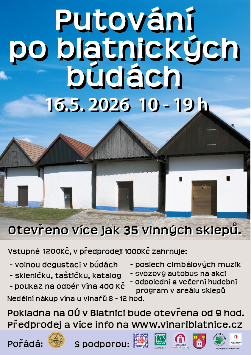 Každoroční hojně navštěvovaná akce, která probíhá v celé obci Blatnice pod Svatým Antonínkem a areálu historických búd Stará hora. Od 10.00 do 19.00 hod. bude otevřeno asi 40 sklepů. Vstupné 1200 Kč (internetový předprodej 1000 Kč) zahrnuje volnou degustaci ve všech búdách, degustační set (sklenička, taštička, propiska), katalog vinařů s mapou, poukazy na odběr vína v hodnotě 400 Kč, jízdu koňským spřežením, cimbálové muziky, ukázky lidových řemesel, vstup do blatnického muzea, večerní zábavu a další bohatý doprovodný program včetně místních specialit. Svoz na akci z okolních obcí zajištěn. Možnost stanování na fotbalovém hřišti mimo hrací plochu.