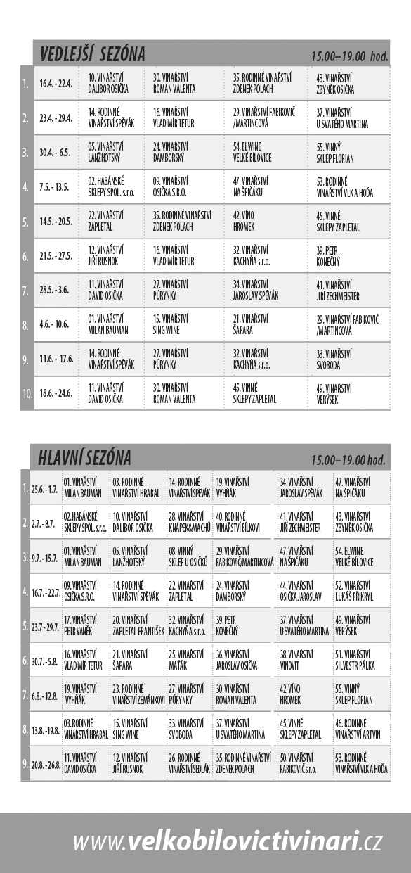 V infocentru na náměstí Osvoboditelů ve Velkých Bílovicích, na informačních cedulí nebo na webu spolku Velkobílovičtí vinaři zjistíte, kdo má v daný termín otevřený sklep.
