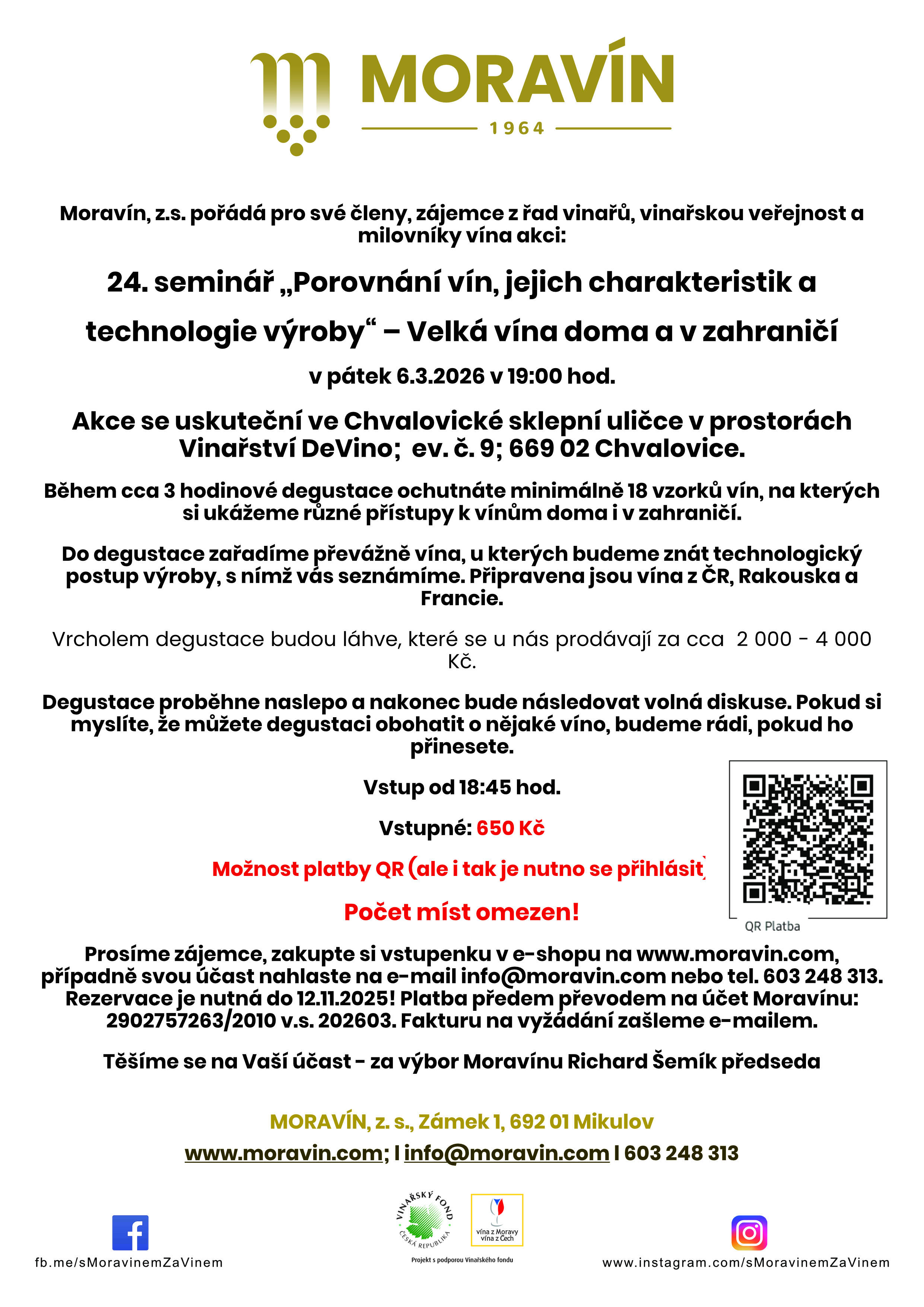 Prosíme zájemce, zakupte si vstupenku v e-shopu na www.moravin.com, případně svou účast nahlaste na e-mail info@moravin.com nebo tel. 603 248 313. Rezervace je nutná do 12.11.2025! Platba předem převodem na účet Moravínu: 2902757263/2010 v.s. 202603. Fakturu na vyžádání zašleme e-mailem.