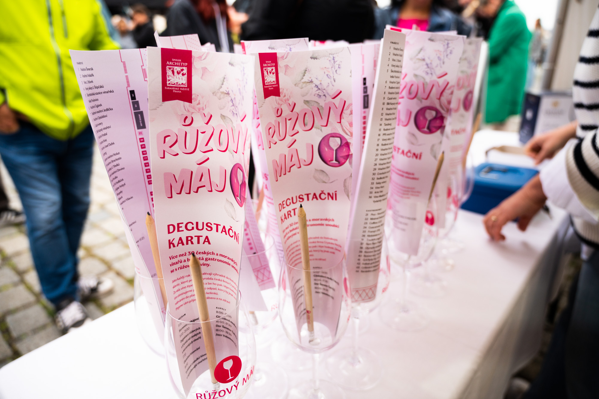 K dispozici bude festivalová sklenice Crystalex (0,35 l) s logem akce. Poznámky k jednotlivým vínům si budete moci zapisovat do degustační karty se jmény všech vinařů. K tomu teplá i studená gastronomie, míchané drinky a hudba, která se odpolednem line jako růžová stuha — cimbálovka, jazz, swing.