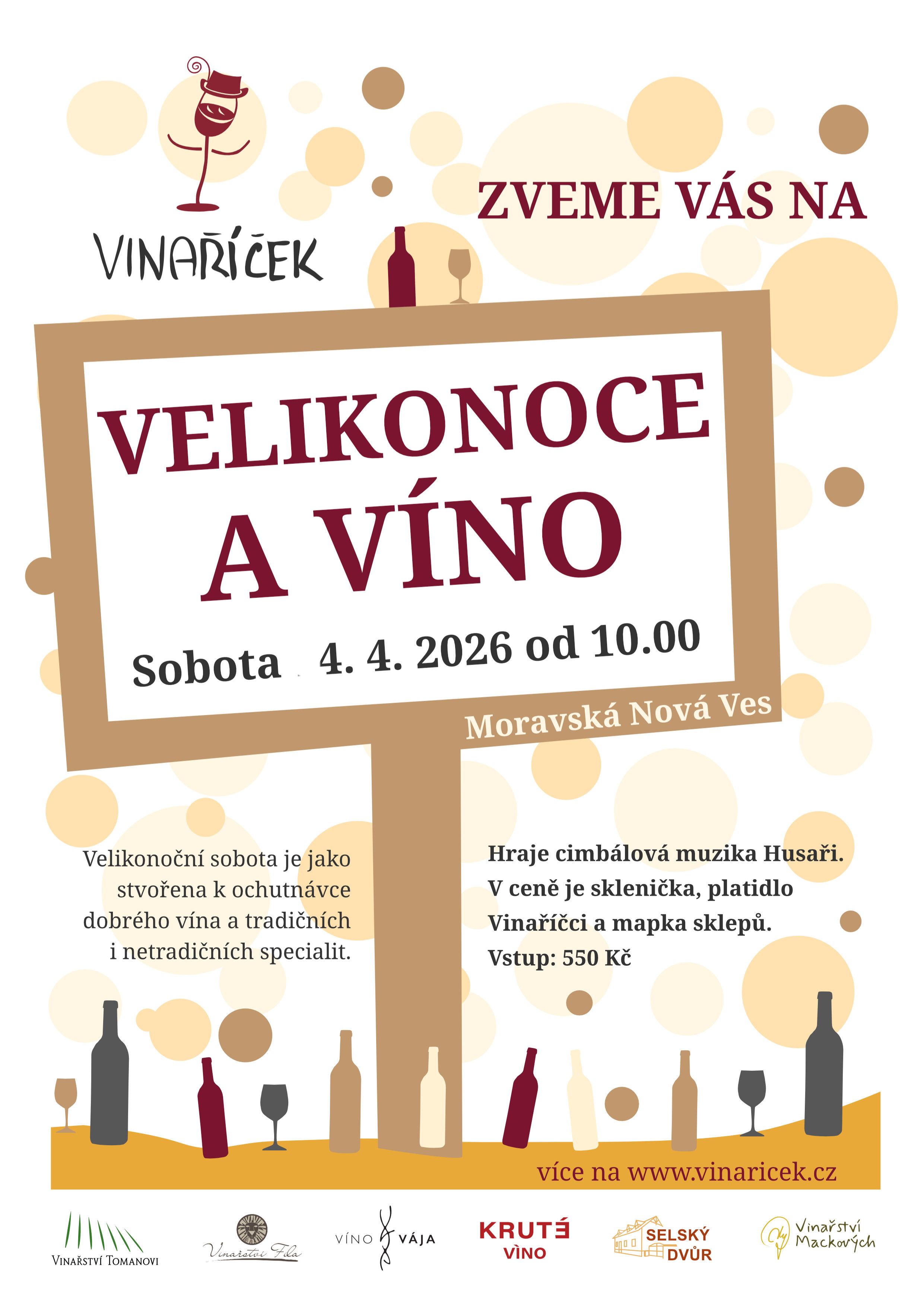 Velikonoční sobota je jako stvořená k ochutnávce vína a dobré zábavě. Proto Vinaříček pořádá od roku 2013 akci “Velikonoce a víno”. Kromě vína vám členové spolku nabídnou tradiční i netradiční velikonoční dobroty. K dobré náladě přispěje cimbálová muzika Husaři.
