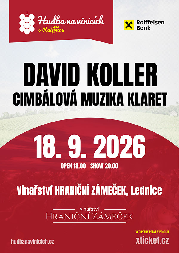 Hudba na vinicích dál expanduje! Do mapy oblíbeného seriálu open-air koncertů přibývá další výjimečné místo – Vinařství HRANIČNÍ ZÁMEČEK v Lednici. Nová jihomoravská zastávka přivítá 18. září 2026 Davida Kollera rovnou jako dvojkoncert s oblíbenou, místní, cimbálovou kapelou Klaret.