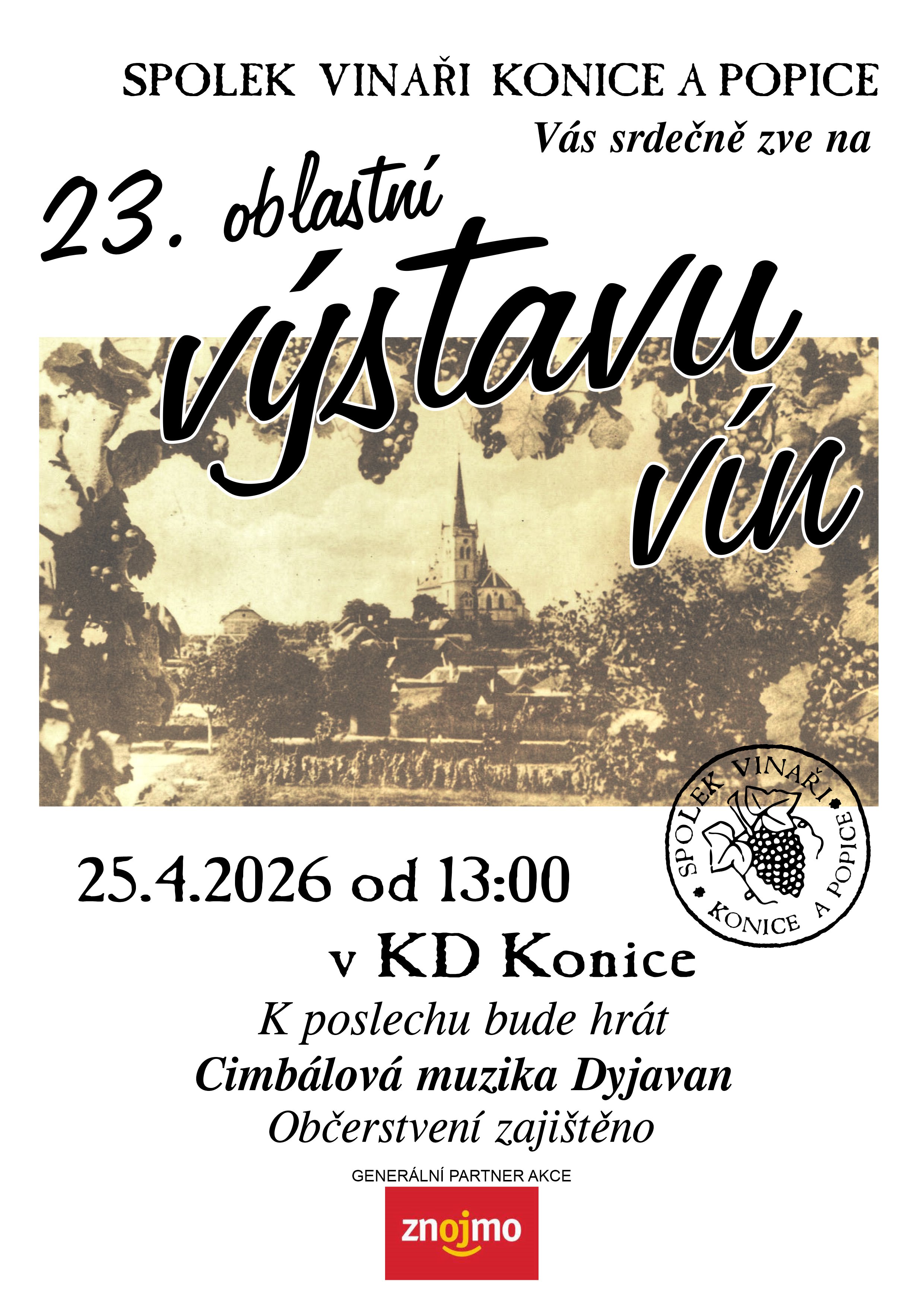 Spolek vinaři Konice a Popice pořádá v sobotu 25. dubna 23. oblastní výstavu vín. Začátek ve 13.00 hod. v kulturním domě Konice u Znojma.