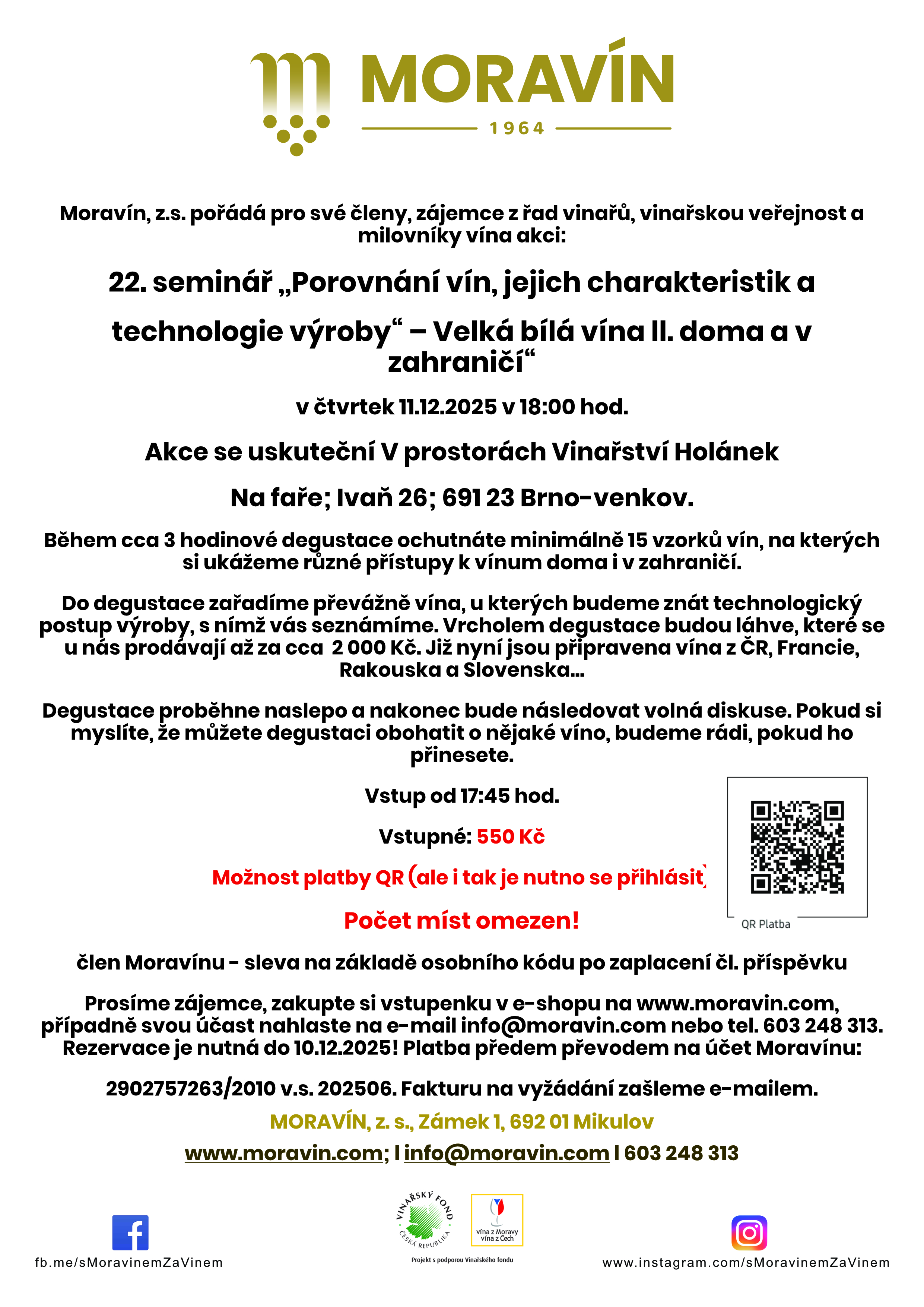 Moravín, z.s. pořádá pro své členy, zájemce z řad vinařů, vinařskou veřejnost a milovníky vína akci: