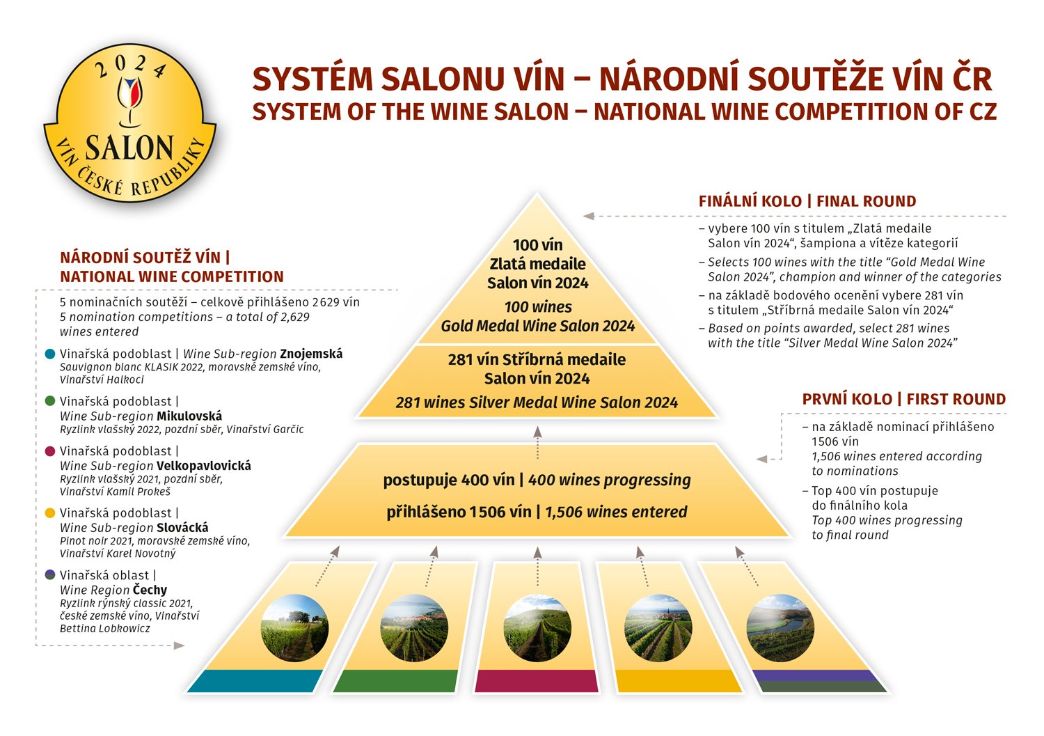 Wina zgłoszone do Salonu Win muszą najpierw przejść przez system regionalnych konkursów nominacyjnych Narodowego Systemu Konkursów Win, gwarantowanych przez Związek Winiarzy Republiki Czeskiej (w regionie winiarskim Morava 4 konkursy dla podregionu Znojmo, Mikulov, Velkopavlovice i Slovacka oraz jeden wspólny konkurs dla regionu winiarskiego Bohemia). Tylko na podstawie nominacji winiarz może zgłosić swoje wino do oceny w konkursie finałowym - Salonie Win - narodowym konkursie winiarskim Republiki Czeskiej, gdzie ocena jest dwuetapowa. Najpierw jury ekspertów wybiera w pierwszej rundzie 400 najlepszych win, a z nich w drugiej - finałowej rundzie 100 najlepszych win, które otrzymują złoty medal Salonu Win Republiki Czeskiej. Pozostałe wina z finałowej dwusetki otrzymają Srebrny Medal Salonu Win Republiki Czeskiej pod warunkiem uzyskania w ocenie końcowej wyniku co najmniej 84 punktów. Całkowita liczba przyznanych medali jest ograniczona do 30% liczby win zgłoszonych w pierwszej rundzie konkursu.